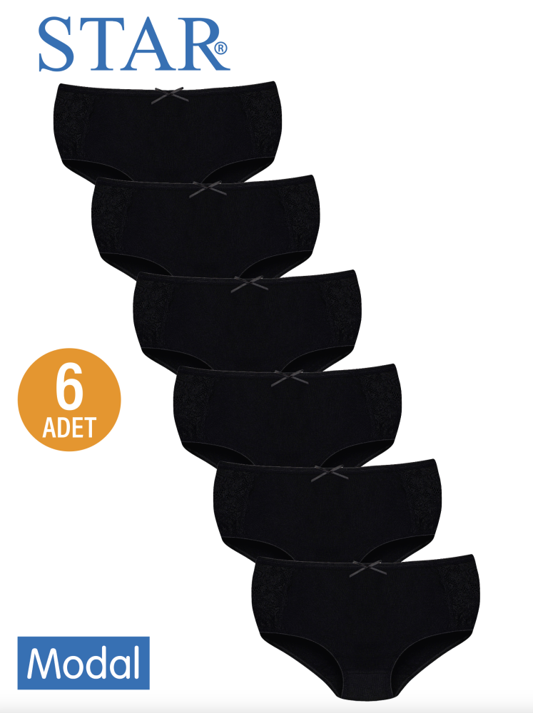 STAR KADIN 6 LI SİYAH MODAL YANI DANTEL DETAYLI BATO KÜLOT